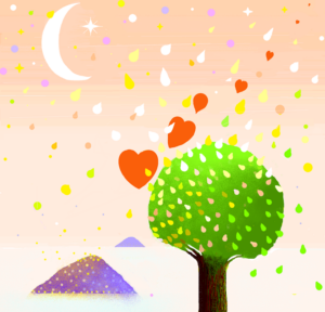 L’amore non è statico, è fluido e avvolgente, i cuori sembrano “volare” dall’albero con i petali dei fiori e suggeriscono un messaggio di amore, di allegria e di vitalità che si espande e si diffonde nel cielo, nell’aria profumata.
